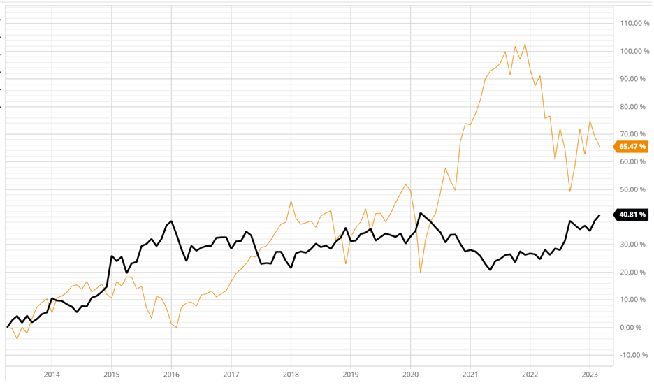 This makes the USD extremely attractive. Take a look at the chart below. The yellow line represents the return of the ACWI over the last 10 years while the black line is DLR.TO, a USD ETF on the TSX that represents the USD-CAD exchange rate. In other words, we’re comparing the CAD performance of USD to the ACWI.